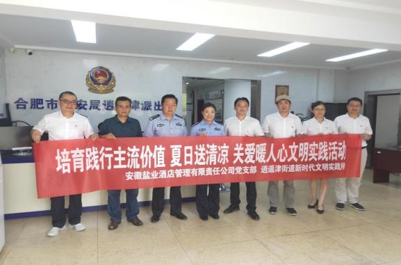 炎炎高溫送清涼,親切慰問暖警心,一聲親切的問候,一瓶清涼的礦泉水,表達著對一線勞動者的敬意。8月10日下午,酒店管理公司黨支部的黨員志愿者們,在逍遙津街道文明辦鐘主任的陪同下,來到合肥市廬陽區逍遙津派出所,看望慰問辛勤堅守在第一線的基層民警們,并為他們送去礦泉水、防暑降溫包等慰問品,感謝他們在維護轄區治安秩序和諧穩定等方面做出的突出貢獻。