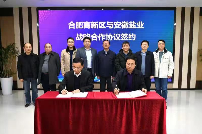 省鹽業集團黨委副書記、總經理、董事王思軍、合肥市高新區管委會副主任韋建華代表雙方簽署戰略合作協議。省鹽業集團黨委委員、副總經理楊曉彬,省國資委企業改革處相關負責人,安徽環境科技集團、高新區生態環境分局、財政局、高新集團等相關負責人參加簽約儀式。