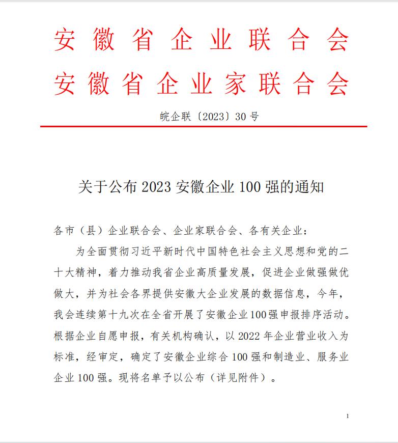 2023年11月22日,安徽省企業聯合會、安徽省企業家聯合會舉辦了2023安徽百強企業發布會暨企業家論壇,現場發布了“2023安徽省百強企業”榜單,及“2023安徽省制造業百強企業 ”“2023安徽省服務業百強企業”榜單。該活動迄今已經連續開展十九屆,基本囊括了安徽營收規模排在前列的各類企業。