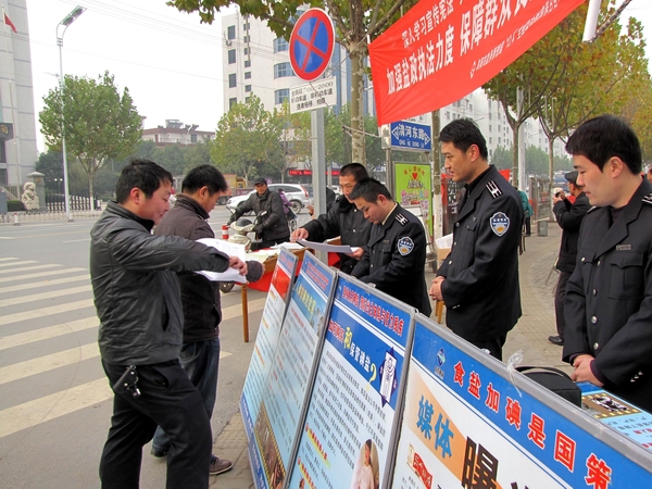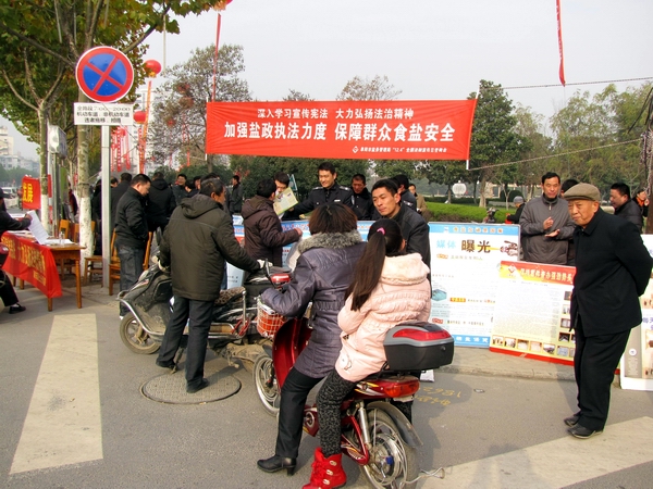 阜陽市鹽務(wù)局高度重視此次宣傳活動,結(jié)合自身業(yè)務(wù)范疇,精心準(zhǔn)備大量法制宣傳資料。早晨7時,天氣陰冷,寒風(fēng)勁吹,我局鹽政執(zhí)法人員在副局長王道亞的帶領(lǐng)下,早早地布置好法制宣傳臺。在活動現(xiàn)場王道亞親自向過往群眾宣傳鹽政法律法規(guī)知識,宣傳消費者、經(jīng)營者的權(quán)利和義務(wù),宣傳消費者如何依法維權(quán);進行了假冒偽劣食鹽展示和鑒別;開展了涉鹽咨詢、受理投訴舉報。此次宣傳共發(fā)放宣傳資料500余份,接受群眾咨詢200余人次。活動現(xiàn)場布置了咨詢展臺,擺放宣傳圖板10塊、宣傳展架3個、懸掛 2條生動主題橫幅,展示了近期查獲的部分劣質(zhì)私鹽樣品,教市民辨別真假碘鹽的活動,咨詢臺前觀看宣傳圖版和前來咨詢的群眾絡(luò)繹不絕,受到了親自趕赴現(xiàn)場慰問的市人大常委副主任李新才、市政府副市長黃珍、市政協(xié)副主席張永俠、市委宣傳部、市司法局和市依法治市領(lǐng)導(dǎo)小組辦公室有關(guān)領(lǐng)導(dǎo)以及廣大群眾的一致好評。