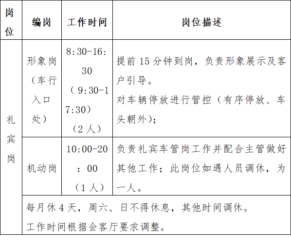 (3)客服崗:選派的客服人員必須經過專業技能培訓,身體健康,品行良好,無違法違紀犯罪前科,具有初中以上文化程度,年齡在21至45周歲、身高1.65米以上。對現場的客戶接待服務工作有一定的意識。