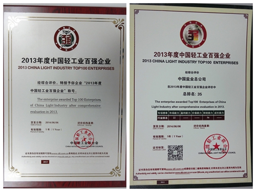 6月6日,中國(guó)輕工業(yè)聯(lián)合會(huì)在北京京西賓館舉辦了以“新經(jīng)濟(jì)、新模式、新視角”為主題的“第三屆中國(guó)輕工企業(yè)家高峰論壇暨輕工百強(qiáng)企業(yè)頒獎(jiǎng)盛典”。大會(huì)發(fā)布了“2013年度中國(guó)輕工業(yè)百強(qiáng)企業(yè)”榮譽(yù)榜單,中鹽總公司榮獲“2013年度中國(guó)輕工業(yè)百強(qiáng)企業(yè)”稱號(hào),在2013年綜合百強(qiáng)榜單中排名35位,并獲市場(chǎng)能力專項(xiàng)排名第22名。