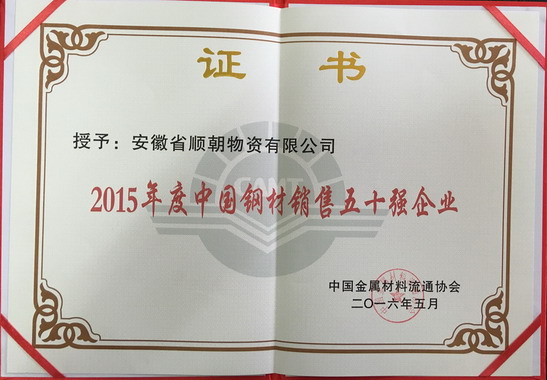 2016年5月27日,第三屆中國鋼鐵產(chǎn)業(yè)企業(yè)家峰會在山東省濱州市隆重開幕,本次峰會由中國金屬材料流通協(xié)會和濱州市博興縣人民政府聯(lián)合主辦,來自中國鋼鐵工業(yè)協(xié)會、中國施工企業(yè)管理協(xié)會、中國汽車工業(yè)協(xié)會等上下游行業(yè)協(xié)會領(lǐng)導(dǎo)、鋼鐵生產(chǎn)、流通、終端用戶等全產(chǎn)業(yè)鏈企業(yè)家近500人出席。會上,安徽順朝第三次蟬聯(lián)中國金屬材料流通協(xié)會授予的“中國鋼材銷售五十強企業(yè)”稱號。
