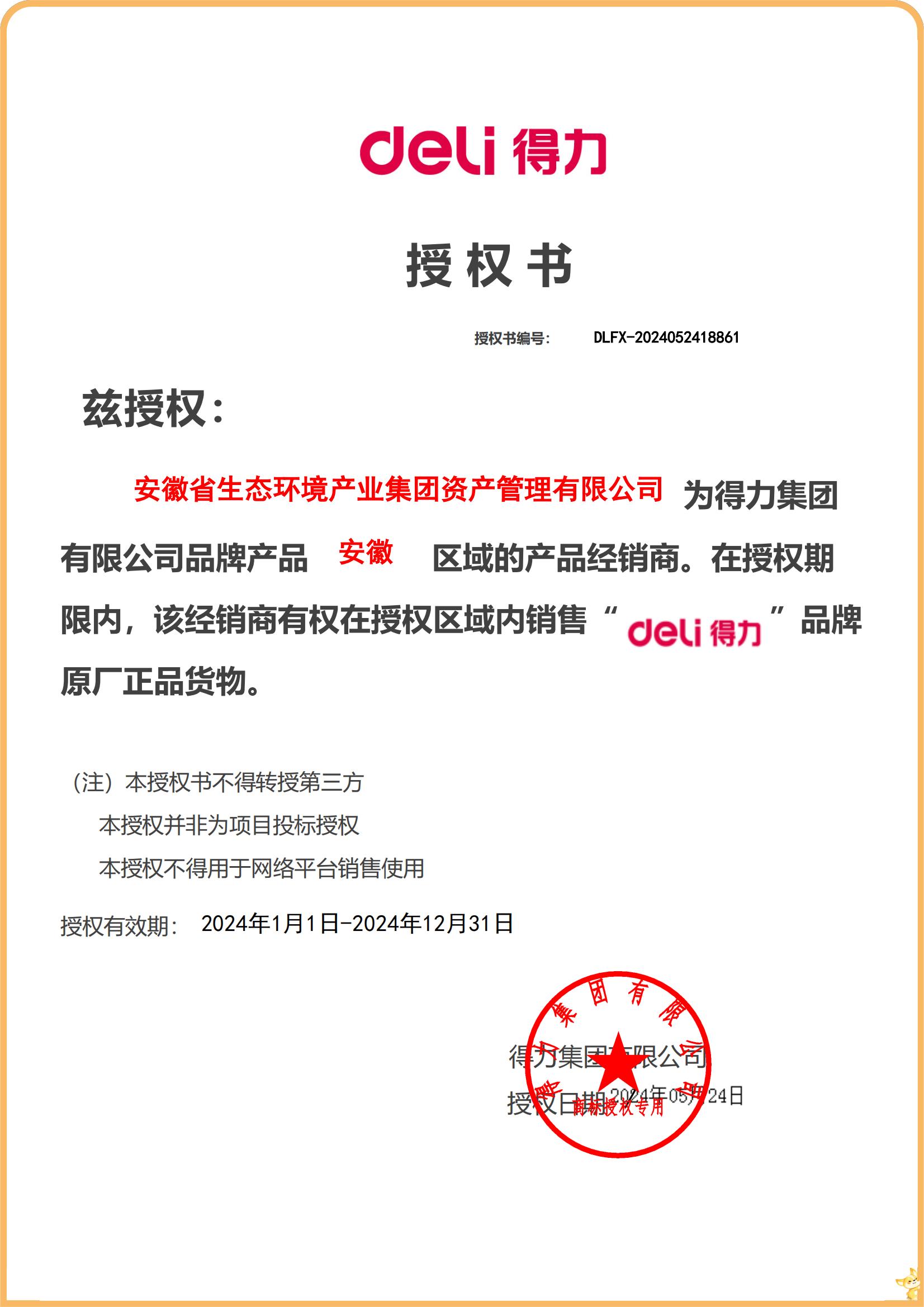 經過不懈努力,5月24日,省生態環境產業集團資產管理公司獲得中國最大的辦公與學習用品產業集團即得力集團的官方授權。